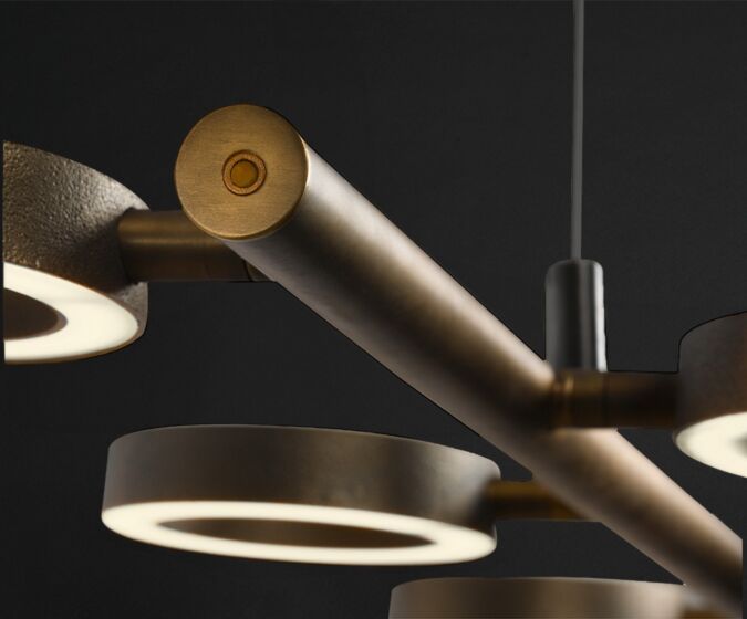 De afwerking in donker messing benadrukt het ambachtelijke karakter van Frezoli en maakt elke lamp uniek door de zichtbare textuur in het metaal.